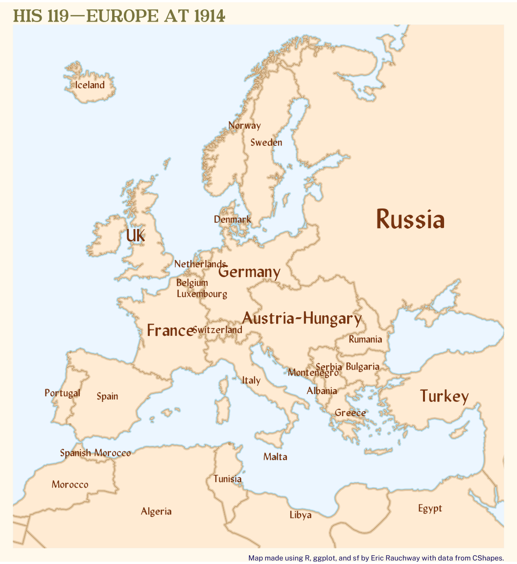 ggplot() +geom_sf(data = borders_14, fill ="antiquewhite1", color ="burlywood3") +geom_sf(data =st_buffer(borders_14, -6000), linewidth =0.6, fill =NA, color =alpha("burlywood3", 0.4)) +geom_sf(data =st_buffer(st_union(st_make_valid(borders_14)), 6000), linewidth =0.4, fill =NA, color =alpha(c("lightblue"), 0.7)) +geom_richtext(data = borders_14,mapping =aes(X, Y, label = mylab),size = borders_14$siz +1,family ="Lydian",fill =NA, color ="chocolate4",label.color =NA, nudge_x = borders_14$nx, nudge_y = borders_14$ny, na.rm =TRUE) +labs(title ="HIS 119---EUROPE AT 1914",caption ="Map made using R, ggplot, and sf by Eric Rauchway with data from CShapes." ) +coord_sf(xlim = disp_win_coord[,'X'], ylim = disp_win_coord[, 'Y'], expand =TRUE) -> pp